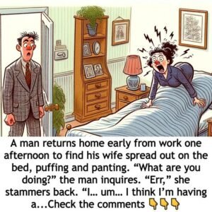 A man returns home early from work one afternoon to find his wife spread out on the bed, puffing and panting. “What are you doing?” the man…