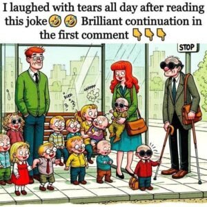 A husband and wife are waiting at the bus stop with their nine children. A blind man joins them after a few minutes. When the bus arrives….